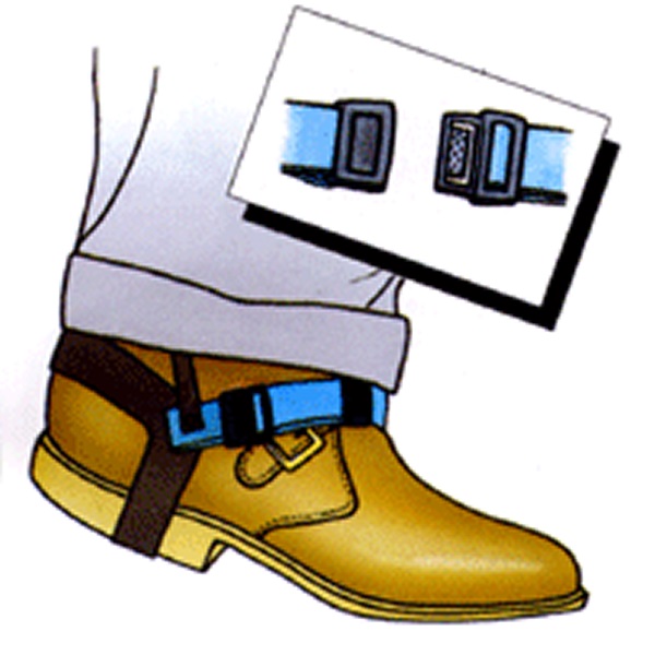 Il copritacco è realizzato in nastro di gomma conduttiva ed il collegamento verso l'operatore è ottenuto inserendo la coda del nastro dentro la scarpa o sotto il calzino.