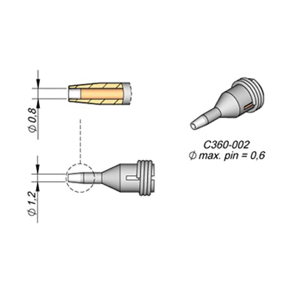 Punta dissaldante con D.I. Ø 0.8 mm e D.E. Ø 1.2 mm, per dissaldare reofori di diametro massimo Ø 0.6 mm con il dissaldatore modello DS360-A