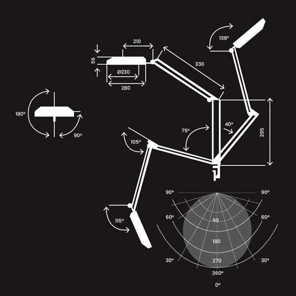 Luce e alimentazione: Lampada con luce a LED, il modello 198-LED garantisce durata e facilità di utilizzo. Il tempo di vita dei LED di questo modello è di circa 60.000 ore di attività. Un dimmer permette di regolarne l’intensità. Per la sua alimentazione si deve utilizzare un cavo AWG 2×21 e si può scegliere tra due tipi di spina: spina di tipo C – schuko – o, su richiesta, quella di tipo G – UK.